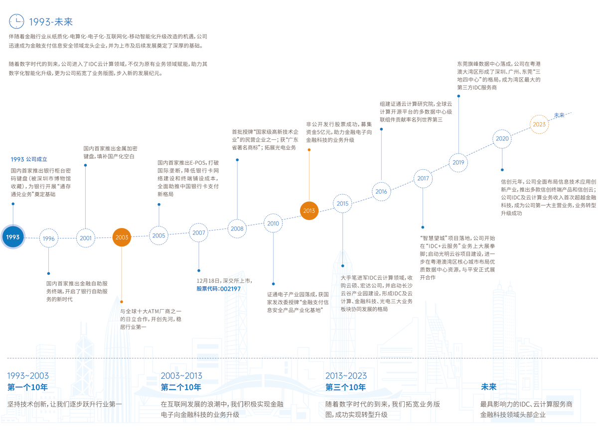 經過二十多年的發展,證通電子已經發展成為涵蓋IDC及云計算、金融科技、證開鴻OpenHarmony業務三大業務板塊的高新技術企業。公司在深圳、長沙和東莞建設了3座產業園,在深圳光明、廣州南沙、東莞石碣、東莞旗峰、長沙望城和武漢神狐共擁有6個大型互聯網數據中心,在深圳南山和光明、廣州、東莞、長沙和西安設立了6個研發中心,在全國分布28個售后服務中心和182個售后服務網點。公司于2021年加入開放原子開源基金會,是開放原子開源基金會OpenHarmony項目群工作委員會委員單位、金融支付專委會副會長單位、油氣專委會副會長單位。2024年以子公司證開鴻運營鴻蒙業務,以“1+N”戰略,深耕金融,賦能醫療、能源、物業等多領域,積極推動開源項目發展,助力產業數智化創新轉型。公司建設了高水平的智慧城市基礎設施平臺和先進的物聯網智慧終端感知網絡,為客戶提供“云+網+端”全方位綜合解決方案,打造以互聯網為基礎平臺、以云計算為核心技術、以金融科技及智慧終端為支撐的云運營商的服務商和金融科技服務商,公司依托于六大數據中心的資源,與平安、華為、百度、騰訊、阿里等知名企業生態圈展開戰略合作,為政府提供!DC+智慧城市的產品及服務;為國有各大型銀行、股份制商業銀行和各中小商業銀行提供包括終端、業務軟件、平臺運營和機房托管等類型多樣的差異化金融支付解決方案,產品足跡遍布全球160余個國家和地區。