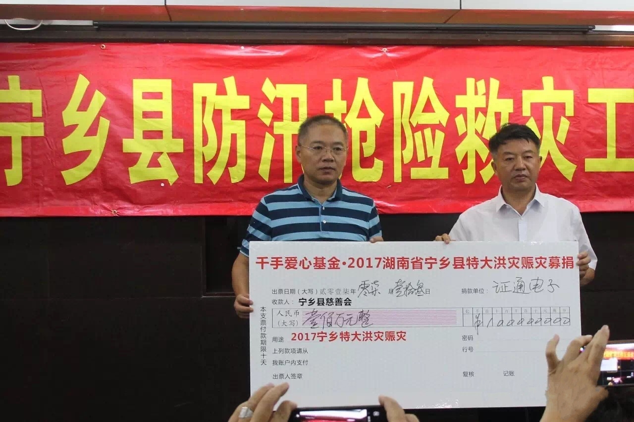 如今,災后重建成為了各受災地區的首要任務,作為心系湖南的湘籍企業家,證通電子總裁曾勝強先生時刻關注家鄉災情,洪水的肆虐也牽動著公司員工們的心。洪災發生后,公司決定通過深圳市長沙商會捐贈抗洪賑災善款人民幣100萬元,7月13日,這筆善款正式捐贈給寧鄉縣慈善會,用于湖南寧鄉的災后重建工作。