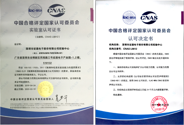 近日,深圳市證通電子股份有限公司實驗中心通過了中國合格評定國家認可委員會(CNAS)的復評認可,此次復評主要涉及體系的換版及檢測能力的擴項,這不僅標志著證通實驗室中心在硬件設施和軟件條件達到了國家認可水平,同時在管理水平和檢測能力又上升了一個臺階,出具的檢測數據和報告具有權威性和公正性,并能得到全球50多個簽署國際實驗室合作認可組織(ILAC)互認協議的成員國和地區的承認,消除貿易壁壘。