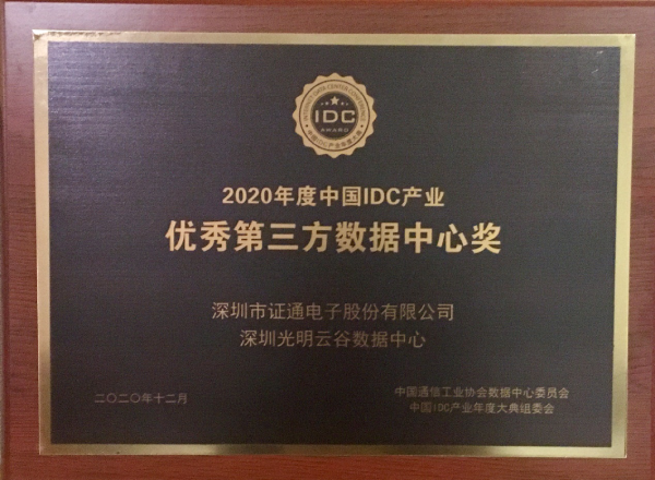 2020年12月8日,由IDC圈主辦的第十五屆“中國IDC產業年度大典”在北京國家會議中心盛大開幕,深圳市證通電子股份有限公司憑借在深圳光明云谷數據中心高可靠、高性能、高安全、綠色節能、可定制的數據中心建設及服務能力,榮獲“2020年度中國IDC產業優秀第三方數據中心獎”。