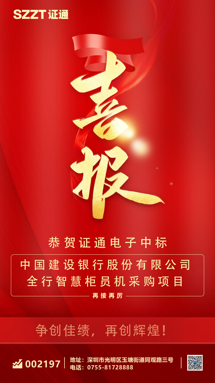 喜報!證通電子中標建行智慧柜員機項目